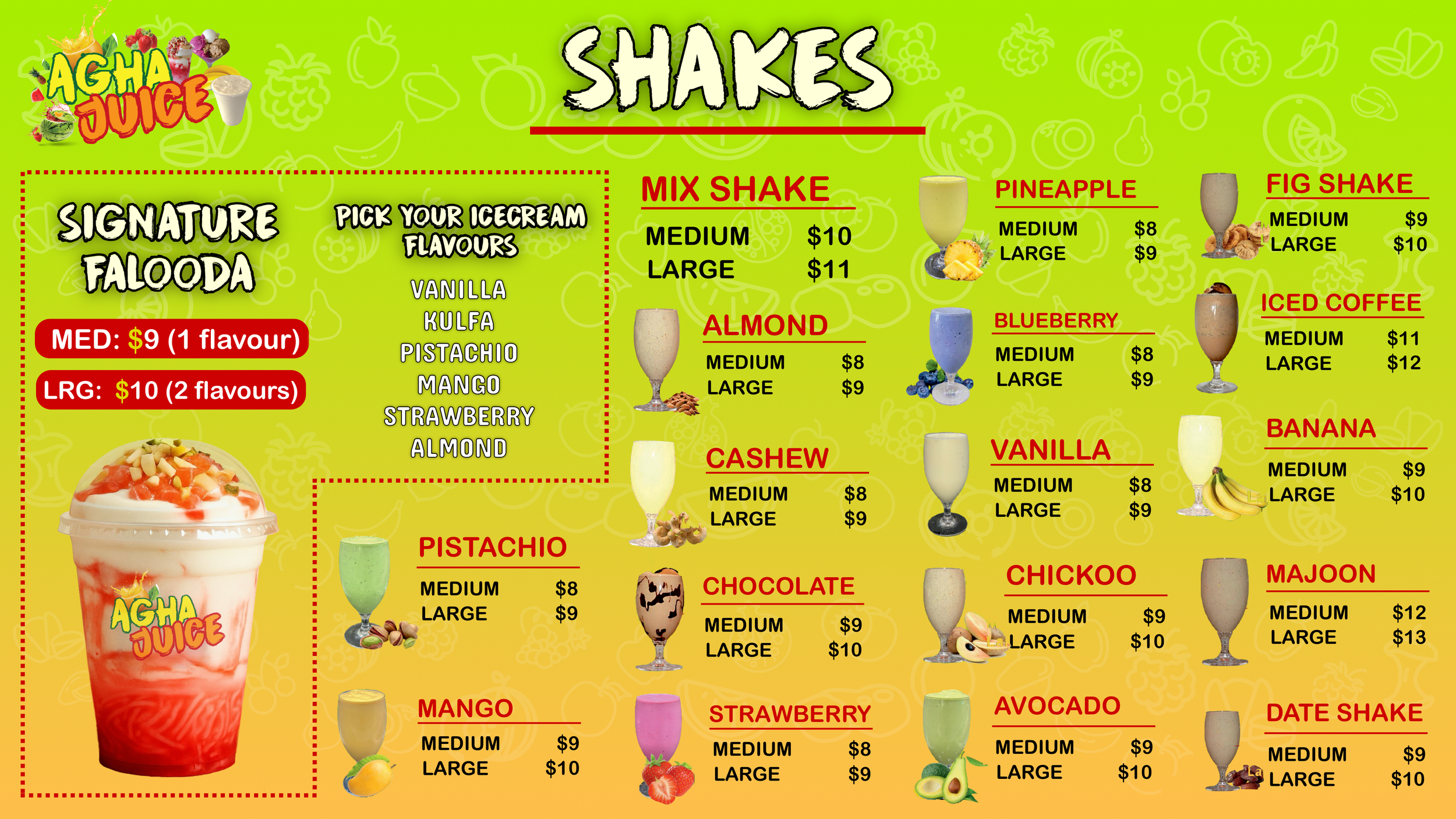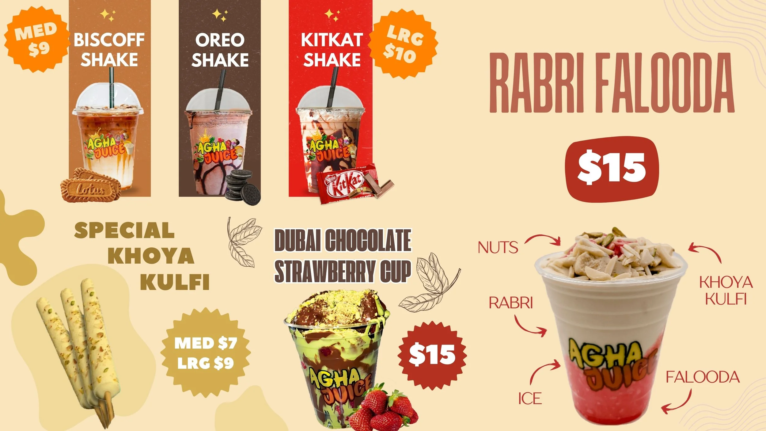 Four colorful Agha Juice drinks with toppings and chocolate, placed on a white wooden surface against a white brick wall.